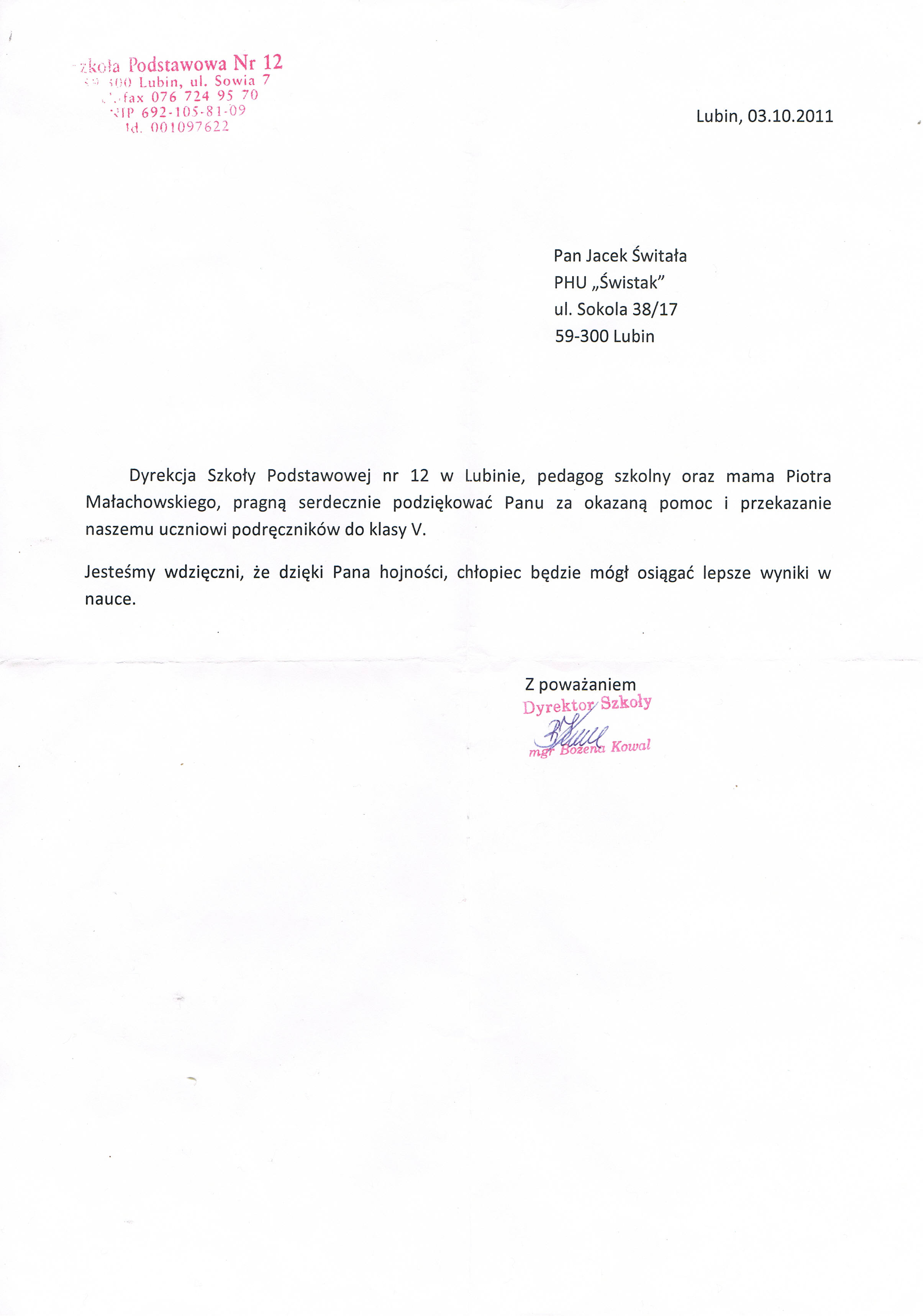 F.H.U. "Świstak" przekazał komplet podręczników na rzecz ucznia klasy V Szkoły Podstawowej nr 12 w Lubinie. Uczniowi życzymy sukcesów w nauce !!!